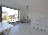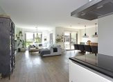 De ruime, tuingerichte woonkamer heeft een open verbinding met de keuken, eethoek en zithoek. Door de openslaande deuren is er toegang naar de zonnige achtertuin. Grote raampartijen aan beide zijden zorgen voor veel natuurlijk daglicht.