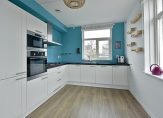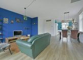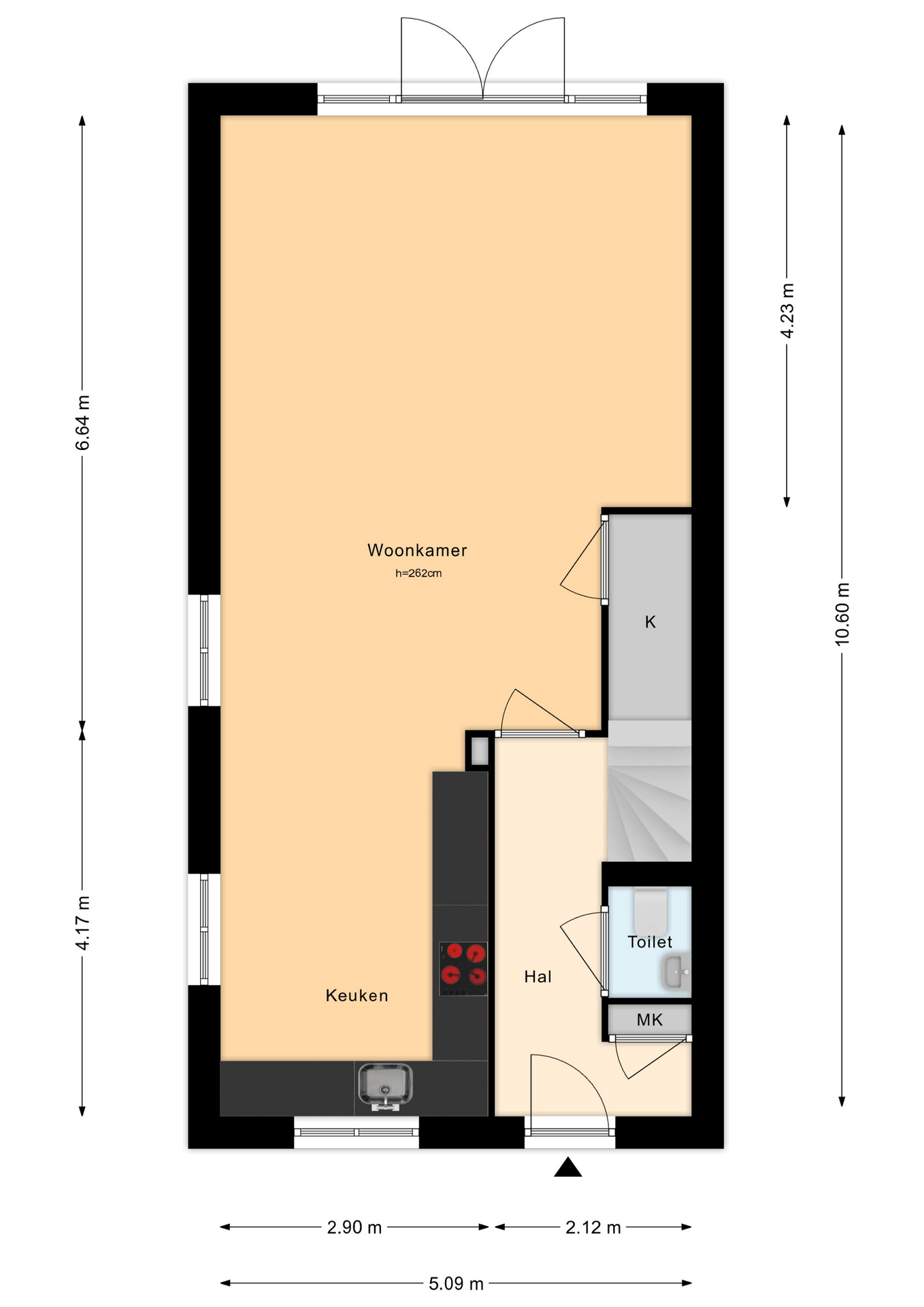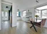 Je komt binnen in de hal met meterkast, toiletruimte met fonteintje en de trap naar de eerste verdieping. Vanuit hier stap je de lichte woonkamer binnen, waar grote ramen en openslaande deuren zorgen voor een prettige lichtinval en een fijne verbinding met de tuin.