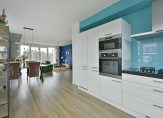 De moderne open keuken aan de voorzijde is compleet uitgerust met diverse inbouwapparatuur, waaronder een gaskookplaat, afzuigkap, koelkast, vriezer, vaatwasser, oven en combimagnetron.