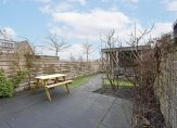 • Diepe, zonnige achtertuin met stenen berging, veranda en elektrisch zonnescherm