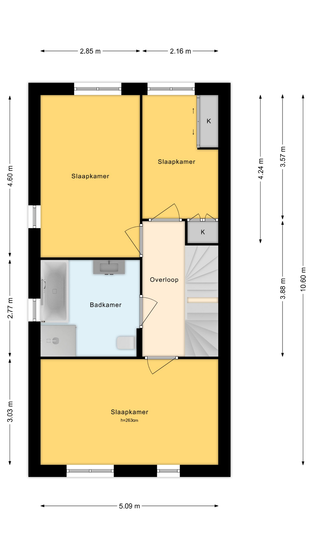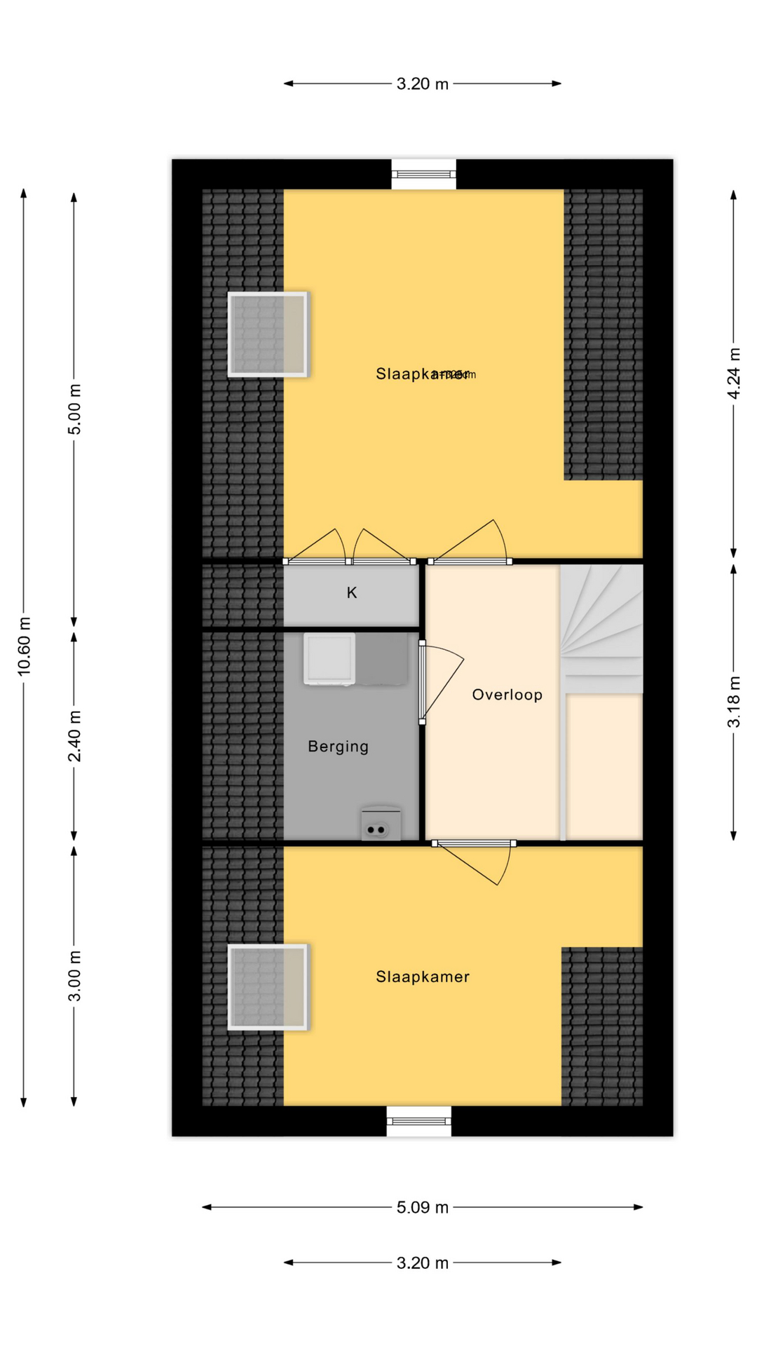 Via een vaste trap bereik je de tweede verdieping met nog eens twee lichte, ruime slaapkamers. Daarnaast is er een technische ruimte met de cv-ketel, mechanische ventilatie en aansluitingen voor wasmachine en droger. Onder de schuine kap is extra bergruimte gerealiseerd.