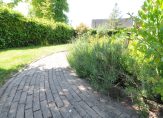 Aan de voorzijde van de woning ligt een nette tuin met toegang tot de voordeur en de zijkant van de woning.