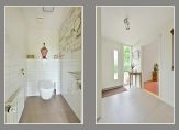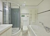 De inpandige badkamer ligt centraal en is voorzien van een douche, ligbad, wastafelmeubel, toilet en een handdoekradiator.