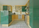 De royale open keuken aan de achterzijde is uitgerust met diverse inbouwapparatuur, zoals een roestvrijstalen fornuis met oven en vijf pitten, een afzuigkap, vaatwasser, koelkast en vriezer. De tegelvloer in de keuken en eethoek is voorzien van aangename vloerverwarming.