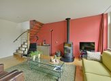Via de entree bereikt u de hal met meterkast en garderobe en toegangsdeur naar de woonkamer. De woonkamer is heerlijk licht dankzij de grote ramen aan de voor- en achterzijde en is voorzien van een sfeervolle houtkachel. Hier bevindt zich ook de open trap naar de eerste verdieping.