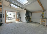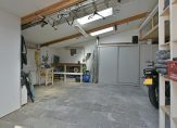 De linker schuur doet nu dienst als werkplaats en berging, met openslaande deuren waardoor ook een auto of motor naar binnen kan.