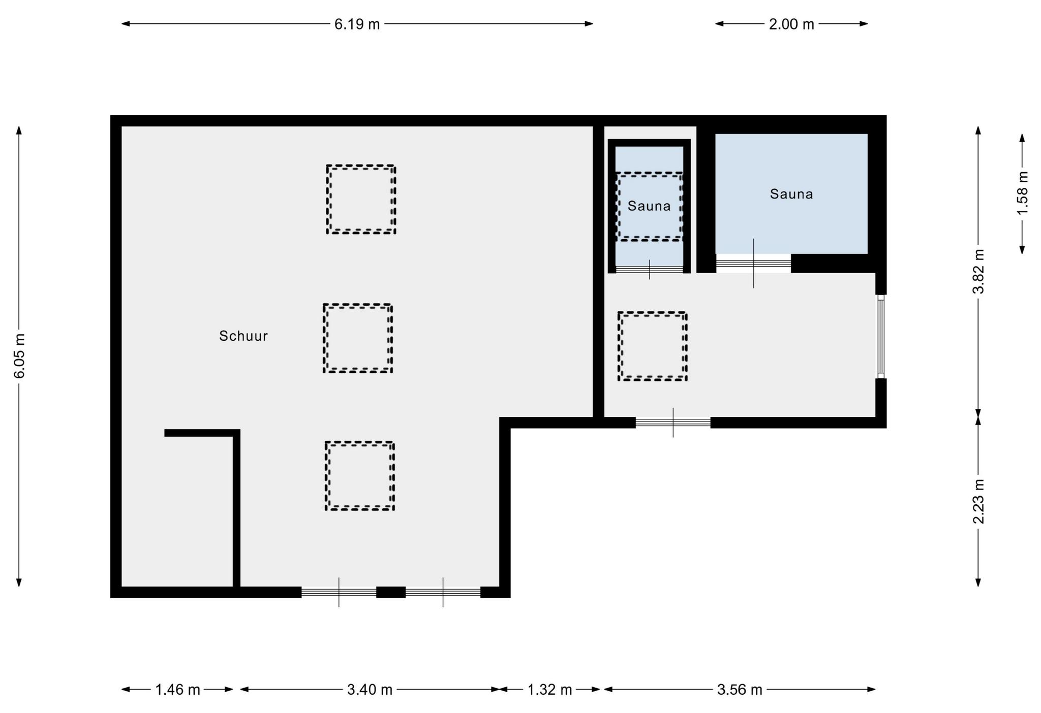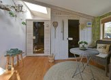 De andere schuur is omgetoverd tot wellnessruimte met zowel een infrarood- als een traditionele sauna. Voor de schuur is een buitendouche geplaatst om na het saunagebruik af te koelen (of op te warmen). Beide schuren zijn geïsoleerd en de grote schuur is vorstvrij door de CV.