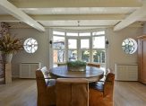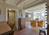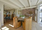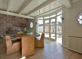 De uitbouw aan de achterzijde biedt een royale eetkamer met prachtig houten vloerdelen, openslaande deuren naar het terras en een zijdeur naar buiten. Twee karakteristieke ronde stalramen geven deze ruimte extra charme.