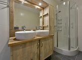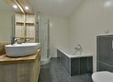 De luxe badkamer is stijlvol ingericht en uitgerust met een ligbad, een douche, een wastafelmeubel met twee wasbakken en een vrijhangend toilet met inbouwreservoir.