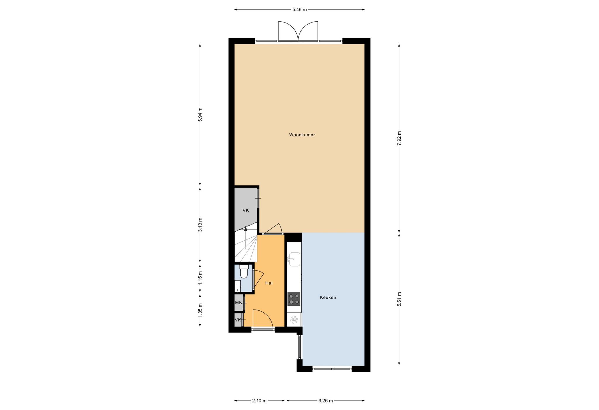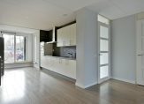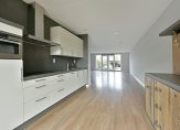Via de entree komt u in de hal, met toegang tot de meterkast en het toilet met fonteintje. Vanuit de hal bereikt u de grote woonkamer, met aan de voorzijde de strak vormgegeven keuken. De keuken is voorzien van louvreluiken voor een aangename lichtinval en uitgerust met een inductiekookplaat, rvs-afzuigkap, combimagnetron, grote Amerikaanse koelkast en vaatwasser.