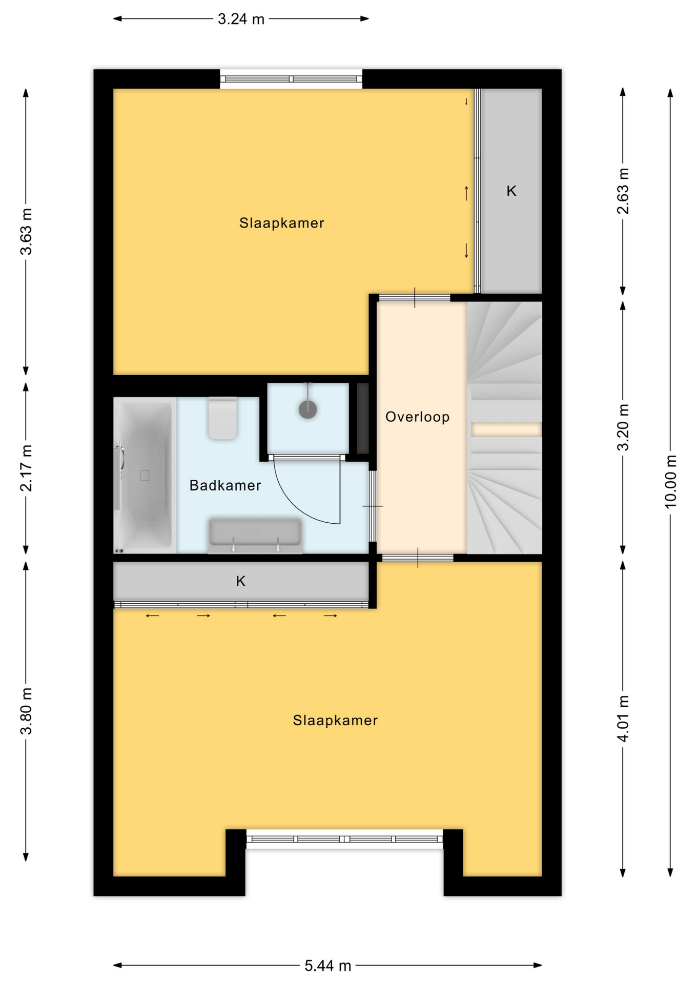 Eerste verdieping; aan de voorzijde ligt een royale, woningbrede slaapkamer met hoge ramen en een grote vaste kastenwand. In het midden van deze verdieping bevindt zich de moderne badkamer met ligbad, aparte douche, tweede toilet en een dubbel wastafelmeubel. Aan de achterzijde ligt de hoofdslaapkamer, eveneens met een vaste kast en veel ruimte dankzij de brede dakkapel. De gehele verdieping is afgewerkt met een PVC-vloer en voorzien van vloerverwarming.