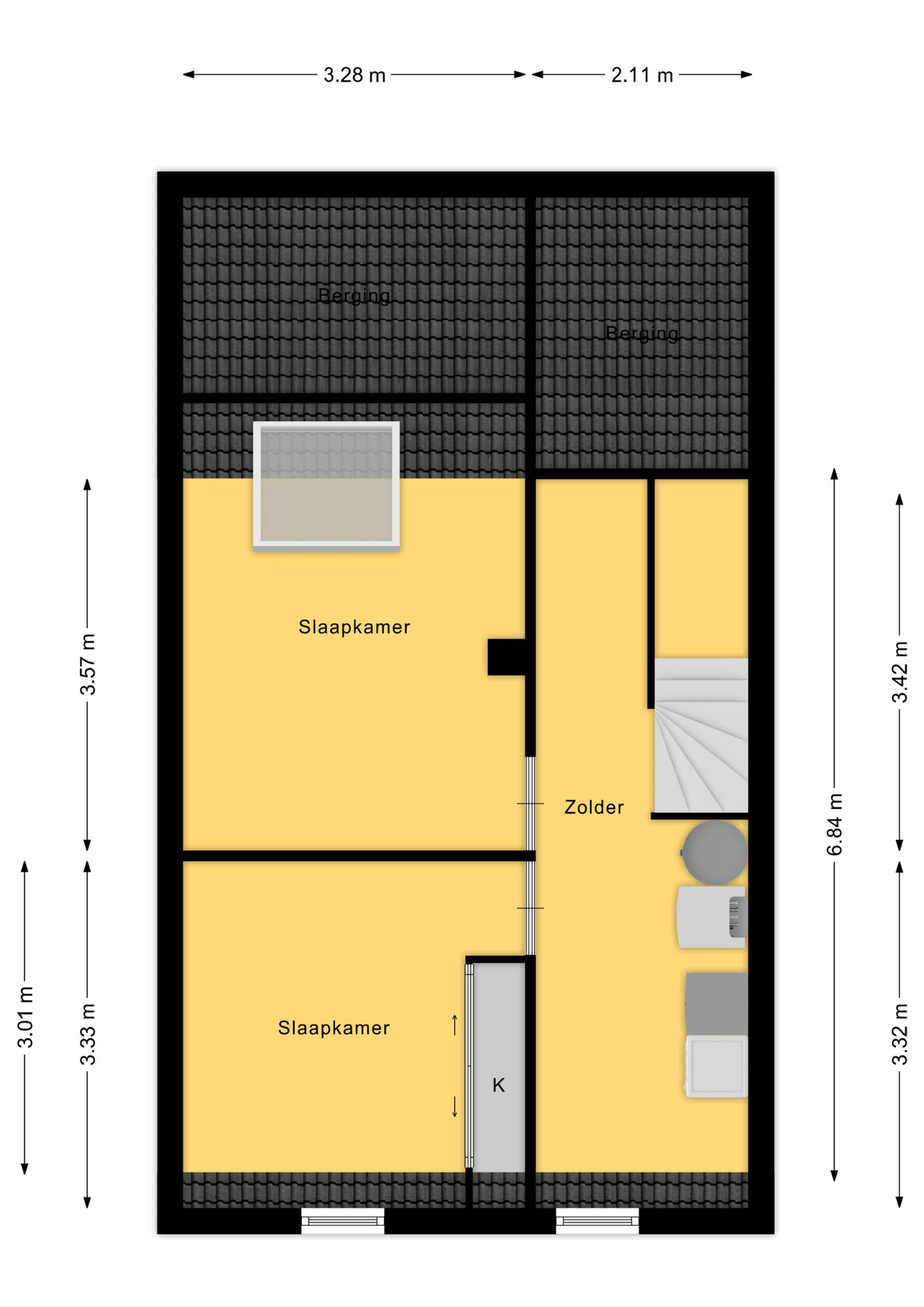 Tweede verdieping; Via een vaste trap bereik je de royale zolderverdieping, waar nog twee volwaardige slaapkamers zijn gesitueerd. Eén kamer beschikt over een groot vast raam, vaste kast en de andere over een hoog plafond, opbergruimte onder de schuine kap en een Velux-dakraam. Op de voorzolder bevinden zich de aansluitingen voor de wasmachine en droger, de warmtepomp met boilervat, de mechanische ventilatie en extra bergruimte onder de schuine kap.