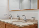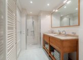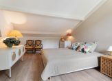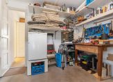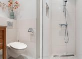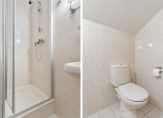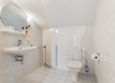 Eerste verdieping: vanuit de overloop is een tweetal slaapkamers (ca. 16 en 14 m2) te bereiken. De badkamer, eveneens vanuit de overloop bereikbaar is voorzien van een doucheruimte, vaste wastafel en een derde toilet. De slaapkamers zijn voorzien van bergruimten achter de knieschotten en vaste kasten / achter de badkamer is een berging met c.v.-ketel / luik naar klein bergzoldertje.