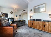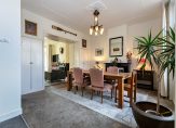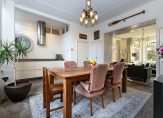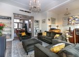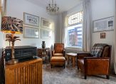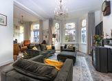 Eerste verdieping: Overloop, modern toilet, woonkamer-en-suite. Deze twee kamers-en-suite bestaan uit een zitkamer aan de voorzijde met diverse authentieke elementen zoals een schouw, glas-in-lood ramen, suite-deuren en een erker. Aan de achterzijde bevindt zich de eetkamer, eveneens met een schouw en met openslaande deuren naar het balkon. In de eetkamer is een vaste trap gerealiseerd naar het dakterras. De moderne open keuken is voorzien van alle gemakken.