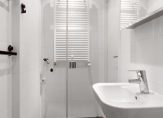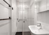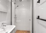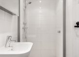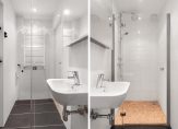 De badkamer is vanuit de keuken toegankelijk. De badkamer beschikt over een douche, een vaste wastafel met meubel en spiegelkast, aansluiting voor de wasmachine en is spiksplinternieuw!