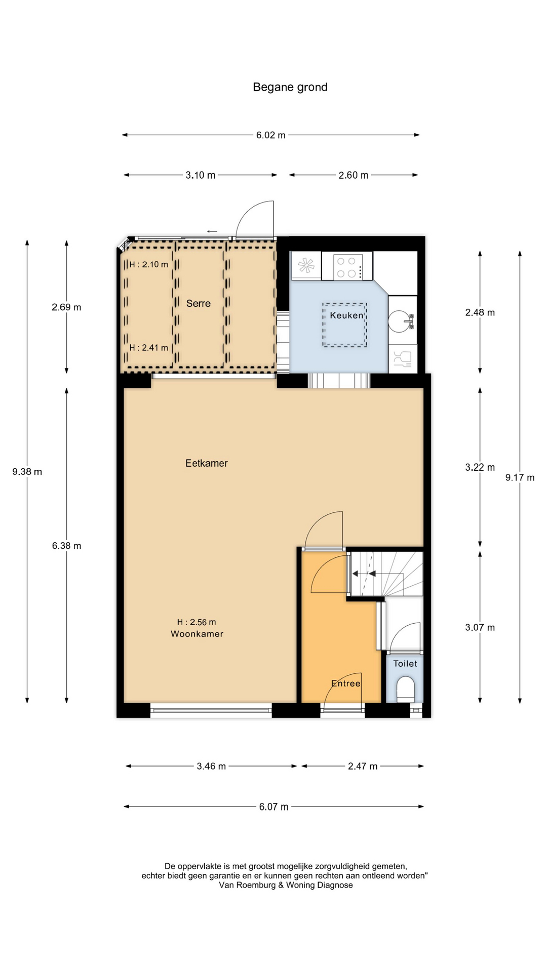 Bij binnenkomst in de woning tref je de hal met een toilet, de trapopgang en een praktische kelderkast. De begane grond is ruim opgezet met een lichte woonkamer, voorzien van een PVC vloer en airconditioning. Aansluitend ligt de keuken met inbouwapparatuur. Aan de achterzijde is een serre aangebouwd met schuifpui en deur naar de zonnige, op het zuiden gelegen achtertuin. De serre is bovendien uitgerust met zonwering.