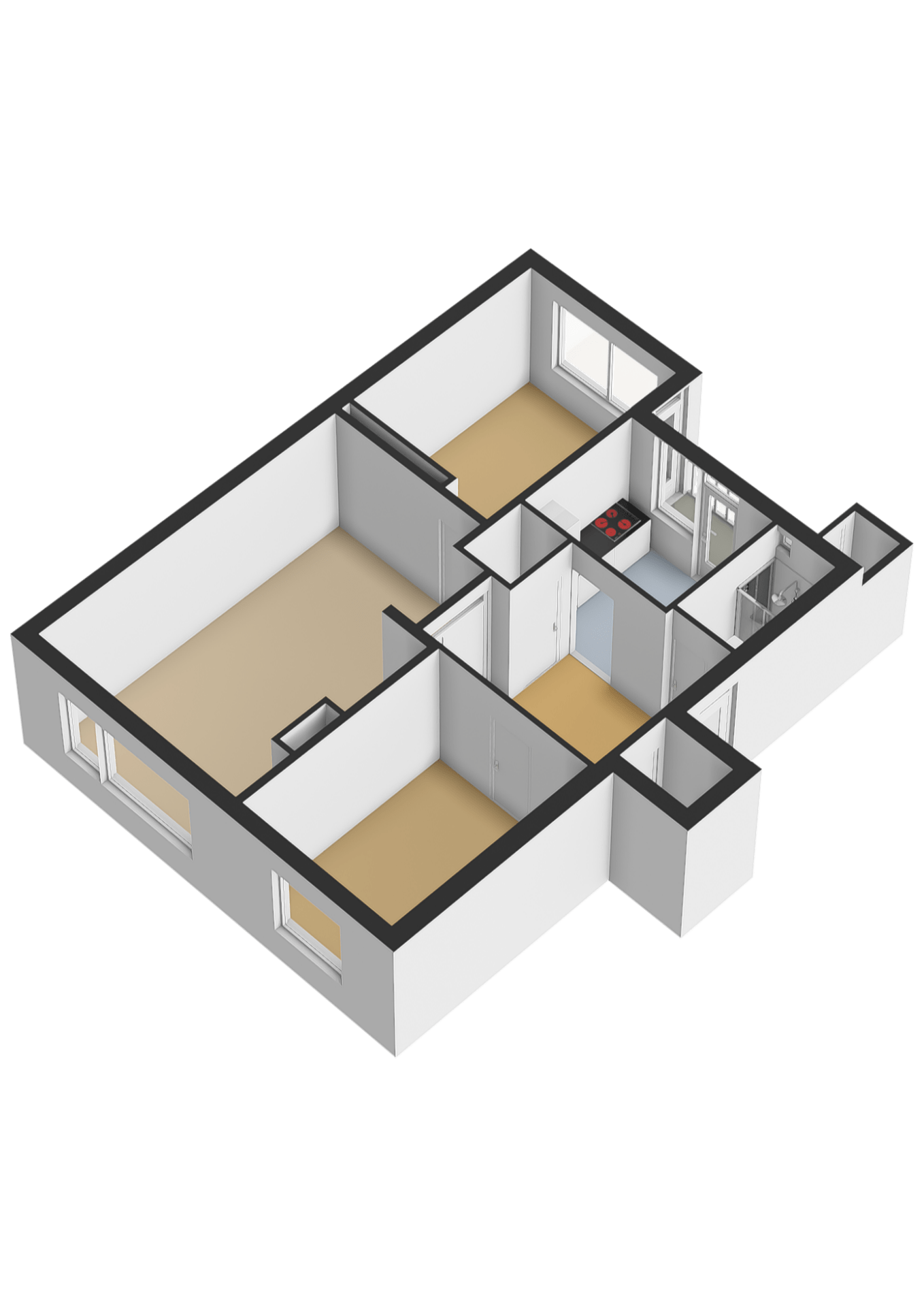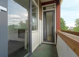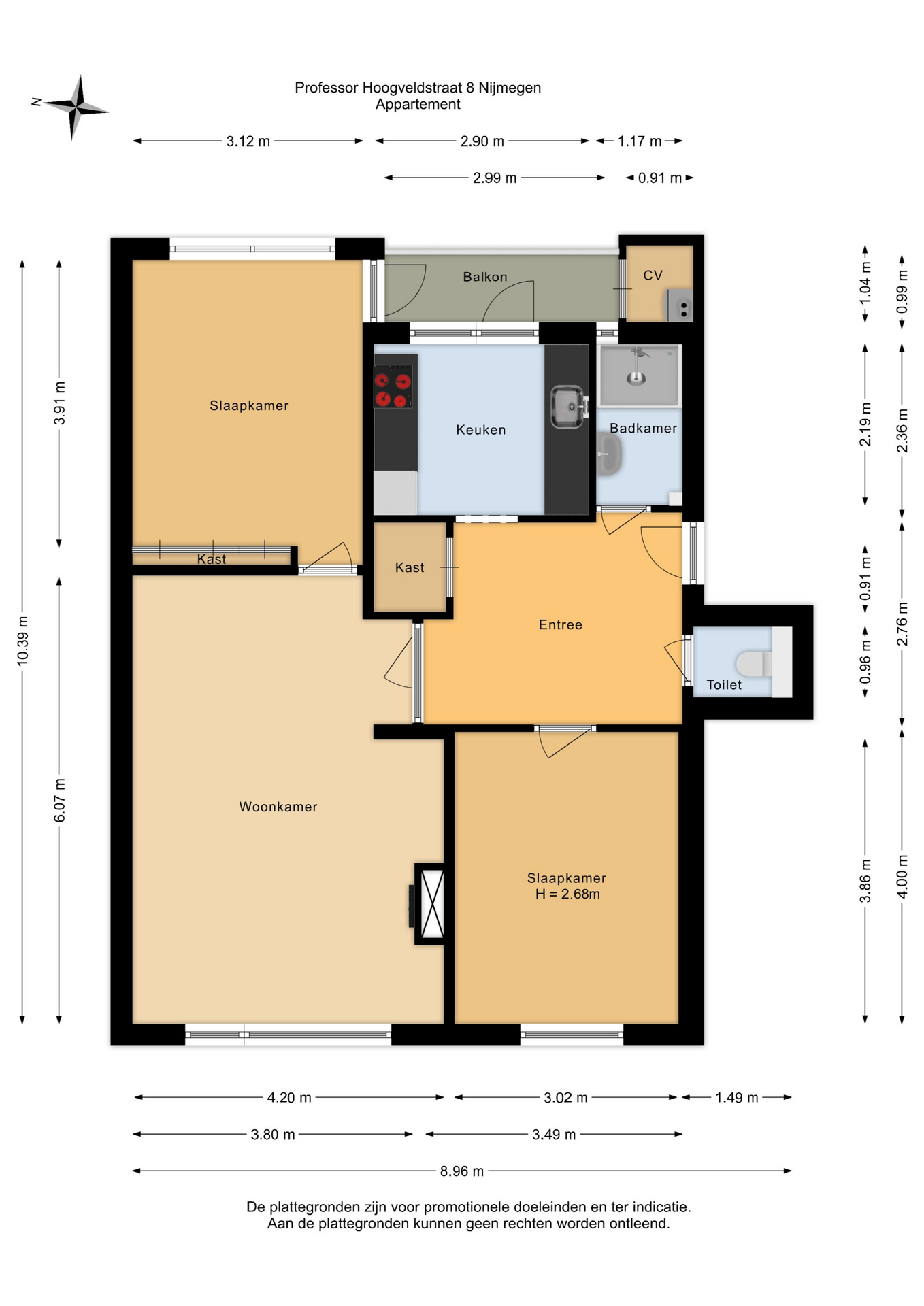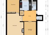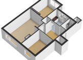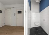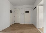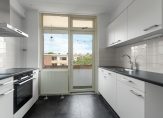 Entree naar het appartement met een ruime hal en een toilet. Aan de achterzijde van het appartement zit de grote slaapkamer met een vaste kast. De tweede slaapkamer bevindt zich aan de voorzijde van het appartement. De badkamer heeft een douche en wastafel. De woonkamer kan worden vergroot door het weghalen van de kastenwand tussen de slaapkamer en de woonkamer. Dan ontstaat er een grote doorzonwoonkamer. De keuken zit tussen de badkamer en de slaapkamer. Het balkon, aan de voorzijde gelegen, ligt op het oosten. De keuken heeft een deur naar het balkon maar ook via de slaapkamer aan de voorzijde is het balkon te bereiken. Het balkon heeft een vaste kast met daarin de cv-ketel.