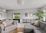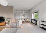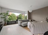 De woonkamer is licht en royaal, met voldoende ruimte voor een comfortabele zithoek en een eettafel. Grote raampartijen zorgen voor veel natuurlijk licht.