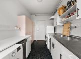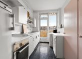De keuken is functioneel ingericht en voorzien van de benodigde apparatuur, inclusief aansluitingen voor was- en droogmachine. Vanuit de keuken heb je toegang tot het balkon aan de achterzijde.