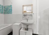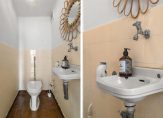 De badkamer beschikt over een ligbad en wastafel; het toilet is apart.