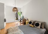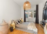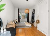 Verderop in de gang ligt de ruime slaapkamer (ca. 15 m²), die eveneens toegang biedt tot de achtertuin.
