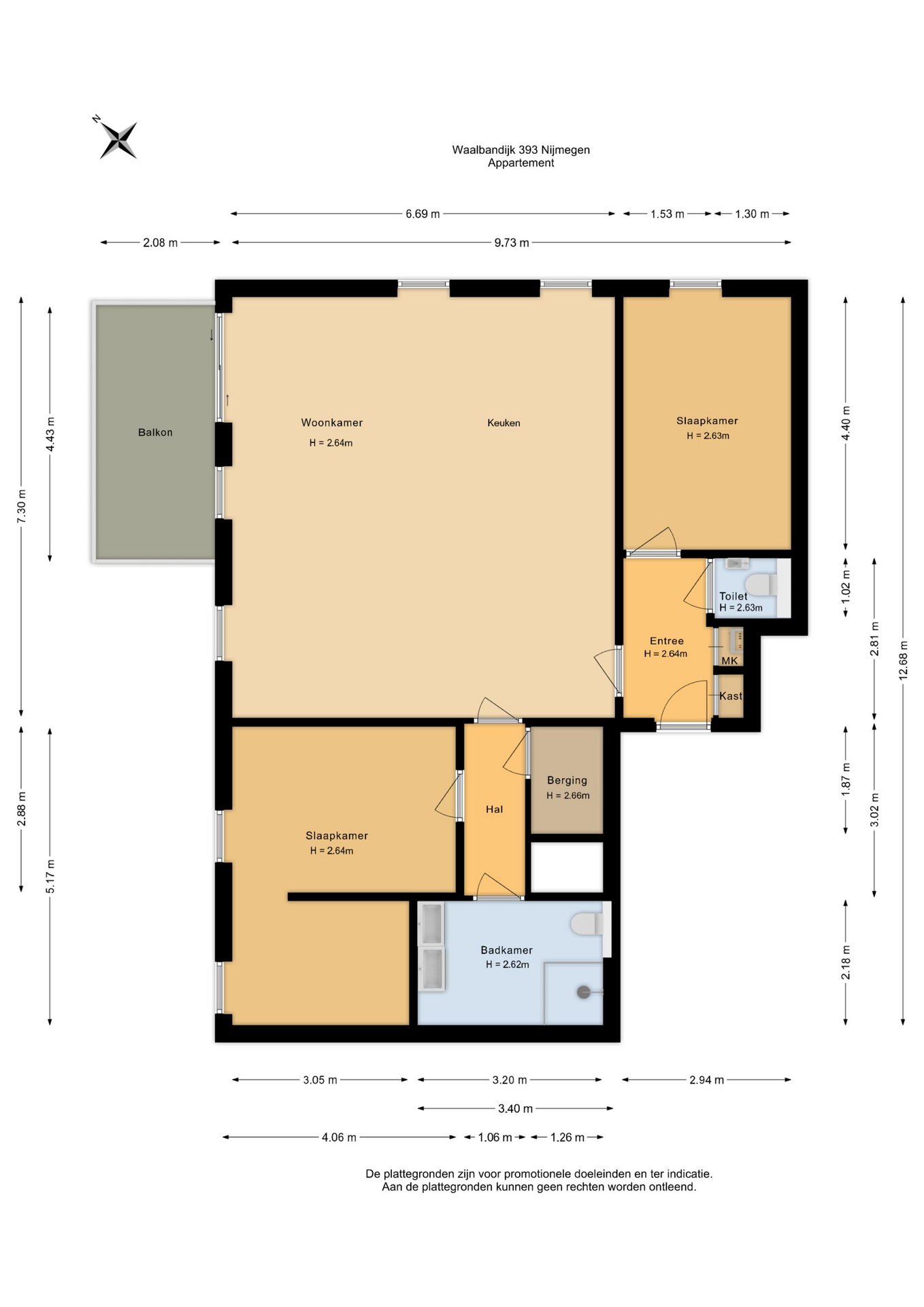 Entree met hal, meterkast en modern toilet. Vanuit de hal bereik je de slaapkamer en de ruime woonkamer van circa 50 m² met toegang tot het balkon op het noordwesten (ca. 9 m²). Via de woonkamer loop je door de gang naar de berging en de slaapkamer met inloopkast. De luxe badkamer is uitgerust met een dubbele wastafel, toilet en inloopdouche.