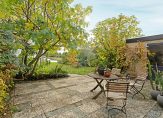 Buiten geniet je van een fijne tuin met veel privacy en een prachtig uitzicht over de omgeving.