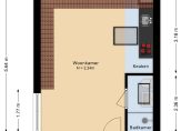 De studio heeft een mooie donkere houtlook vloer die direct opvalt en zorgt voor een warme uitstraling. De schuine wanden en het grote raam geven de ruimte een speels karakter, terwijl het uitzicht op groen voor rust en privacy zorgt.
