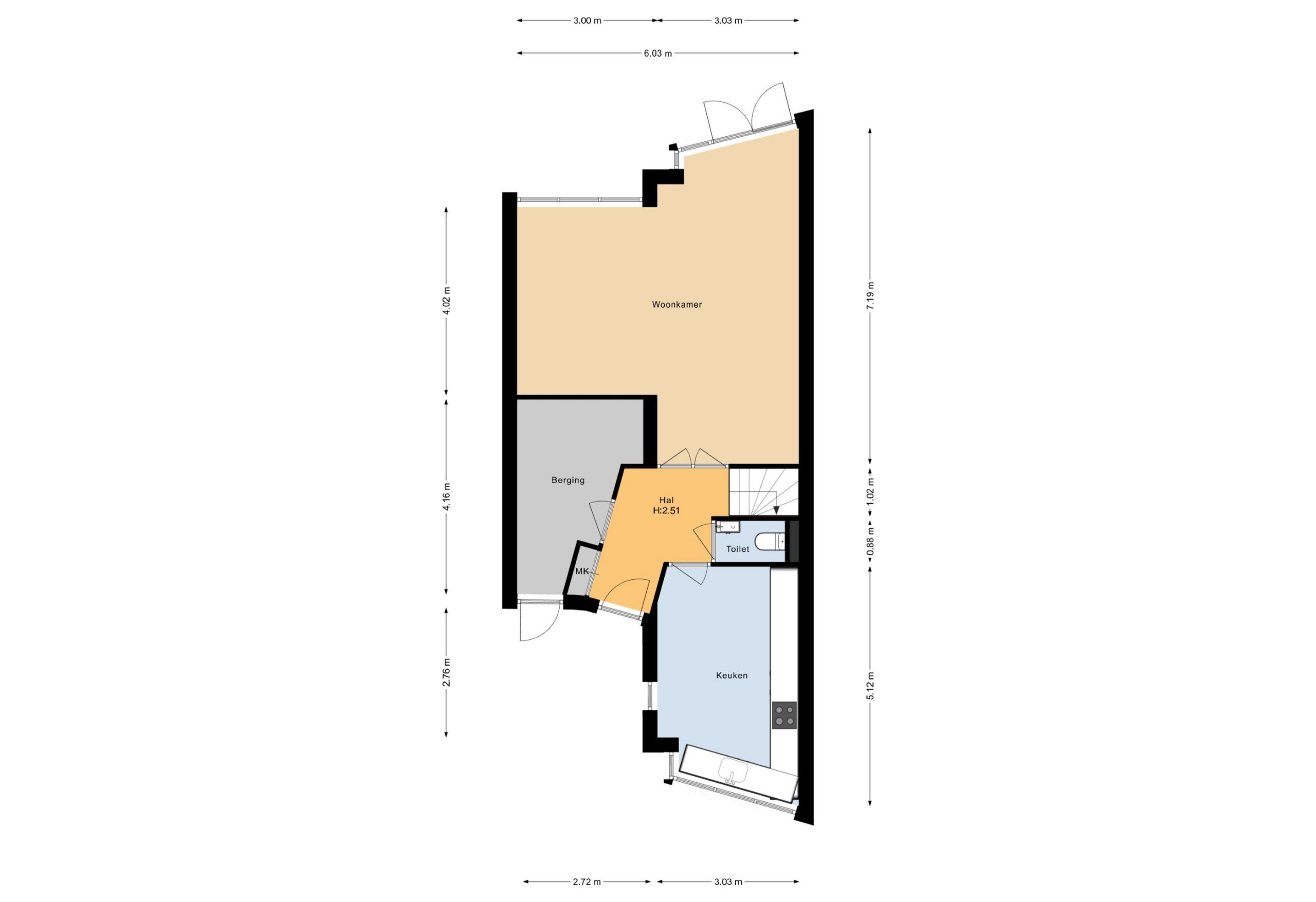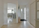 Via de voortuin, met parkeergelegenheid voor één auto op eigen terrein, bereik je de overdekte entree. Binnen kom je in de centrale hal, vanwaar je toegang hebt tot de woonkeuken, woonkamer, het toilet met fonteintje en de inpandige berging/bijkeuken.
