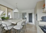 Aan de voorzijde vind je de ruime woonkeuken in een praktische L-opstelling. De keuken is voorzien van diverse inbouwapparatuur zoals een 5-pits gaskookplaat, afzuigkap, kokendwaterkraan, oven, vaatwasser en koelkast. Er is een gezellig zitje gecreëerd waar je heerlijk kunt genieten van een kop koffie in de ochtend of een borrel aan het eind van de dag.