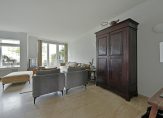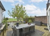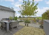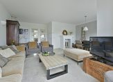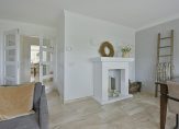 Aan de achterzijde ligt de lichte living met openslaande deuren naar het terras. Vanuit de woonkamer is er een prachtig uitzicht op de landerijen.