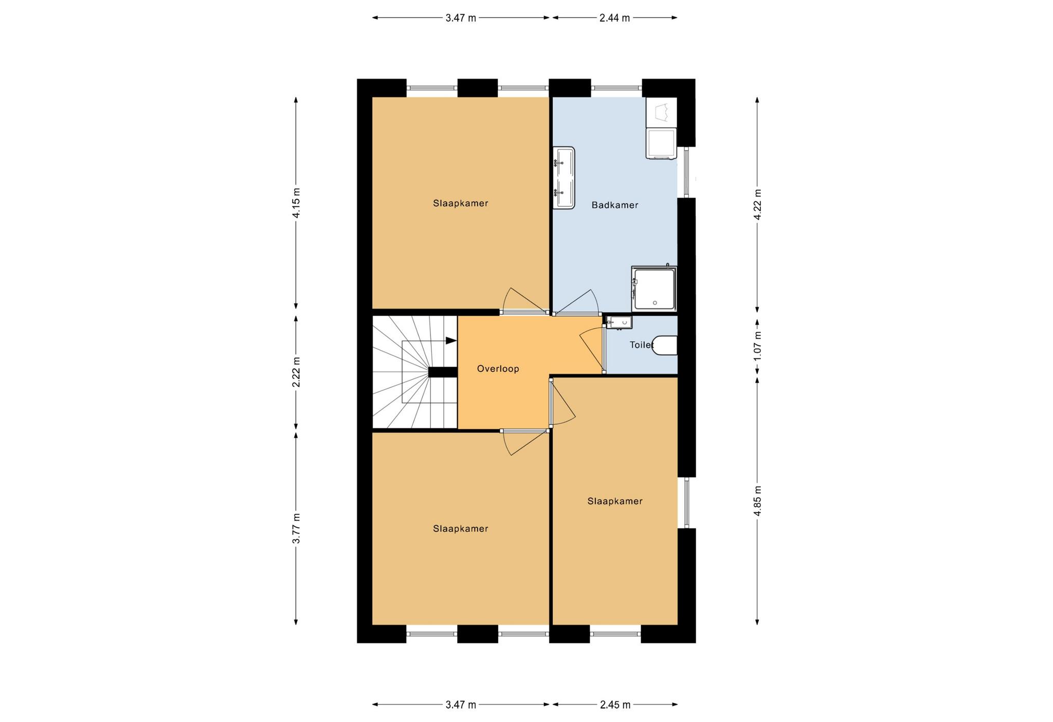 De vaste trap brengt je naar de ruime overloop. Deze geeft toegang tot drie ruime slaapkamers, een separaat toilet en de badkamer.