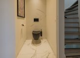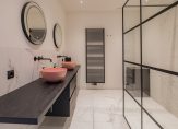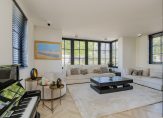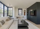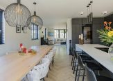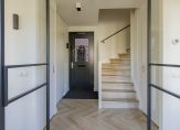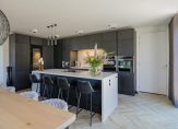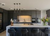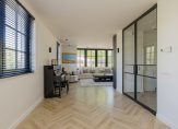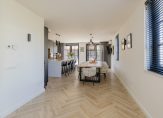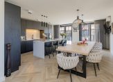 In de hal, met garderobekast en gastentoilet, geven stalen deuren toegang tot de ruime, zeer lichte woonkamer met fraai wandmeubel en een grote erker. Aan de achterzijde van de woning is de ruime woonkeuken met kookeiland gesitueerd – perfect om samen te komen met familie en vrienden. Twee paar openslaande deuren naar de tuin maken dat binnen en buiten moeiteloos in elkaar overlopen. Dankzij de vloerverwarming geniet je hier het hele jaar door van een behagelijke temperatuur.