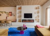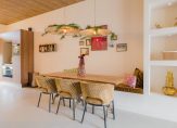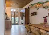 Aan de eettafel is gekozen voor een ingebouwde maatwerk eetbank, die perfect aansluit bij de architectuur van de ruimte en zorgt voor een gezellige, informele setting. Openslaande deuren verbinden de woonkamer met de tuin en laten het daglicht rijkelijk binnenstromen – zomers haal je buiten moeiteloos naar binnen.