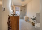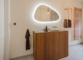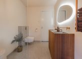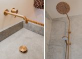 De badkamer is stijlvol en luxe uitgevoerd met een inloopdouche, toilet, maatwerk meubel, natuurstenen wastafelblad, verlichte spiegel en koperkleurige accessoires.