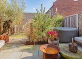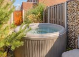 De jacuzzi blijft achter, net als de olijfboom in pot – ultiem vakantiegevoel in eigen tuin. Verder is er een houten berging voor de fietsen / scooter en een achterom met een unieke cortenstalen poort.