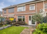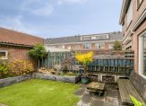 – De achtertuin biedt veel privacy en is gelegen op het Zuidoosten. De tuin is ingericht met een terras, een gazon, gemetselde plantenbakken met beplanting en een waterpartij. Verder is er een zonnescherm, een overkapping voor de kliko’s en een ruime, gemetselde berging (oppervlakte: circa 11 m²), voorzien van elektra. De tuin is tevens bereikbaar via een overdekte achterom naar het achterpad.