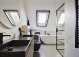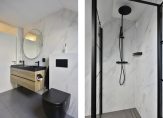 – Luxe en geheel betegelde badkamer, voorzien van een ligbad, douchecabine, een dubbele wastafel en een aansluiting