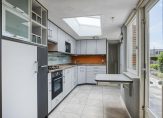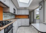– De halfopen keuken (oppervlakte: circa 15 m²) beschikt over een praktische inbouwkast en de meterkast (8 groepen en een aardlekschakelaar) De luxe inrichting in hoekopstelling is voorzien van een oven, 5-pits gaskookplaat met wokbrander, vlakscherm afzuigkap, koelkast met vriesvak, apothekerskast, aparte magnetron en diverse onder- en bovenkasten. Boven de keuken is een lichtstraat die zorgt voor extra lichtinval. Tevens is er een vast ontbijttafeltje en een loopdeur naar de woonkamer.