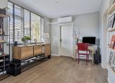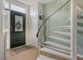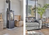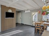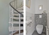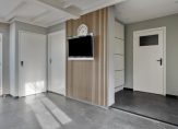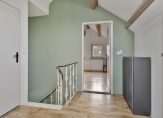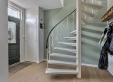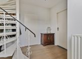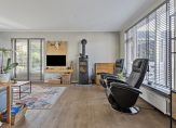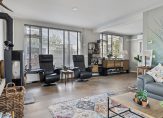 Ruime hal met moderne toiletruimte en stalen spiltrap naar de verdieping. De hal geeft toegang tot de woonkamer en slaapkamer op de begane grond met laminaatvloer. Bij binnenkomst in de ruime woonkamer valt ook gelijk op dat dit een heerlijk lichte leefruimte is, die ook beschikt over openslaande deuren naar de tuin. Op de vloer ligt een mooie lamelparketvloer en de wanden zijn strak gestuukt. Er is een airco aanwezig, waarmee ook de woonkamer te verwarmen is. De aanwezige houtkachel is eventueel over te nemen. Een doorgang tussen woonkamer en keuken beschikt over een vaste (provisie)kast en toegang tot de badkamer op de begane grond met een grote inloopdouche, wastafel met meubel en vloerverwarming.