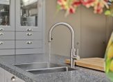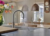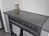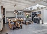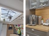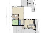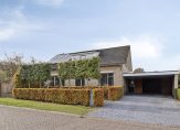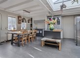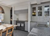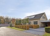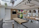 De grote woonkeuken is circa 32 m² groot en ook hier is een veel lichtinval door de verschillende aanwezige ramen en fraaie lichtstraat. In de keuken is een luxe inrichting geplaatst compleet met inbouwapparatuur zoals vaatwasser, Quooker, Amerikaanse koel-/vriescombinatie en een fraai zwart steel fornuis met inductiekookplaat en ovens. In de keuken is voldoende ruimte voor een grote eettafel. Ook in de keuken hangt een airco, waarmee te verwarmen is. Bij de keuken is een praktische kast-/bergruimte, deur naar de garage en toegang tot een portaal met buitendeur naar de oprit met carport. De garage is ruim van opzet en voorzien van een elektrische paneeldeur. Voor de garage staat een carport, die volop ruimte biedt om comfortabel op eigen terrein te parkeren.