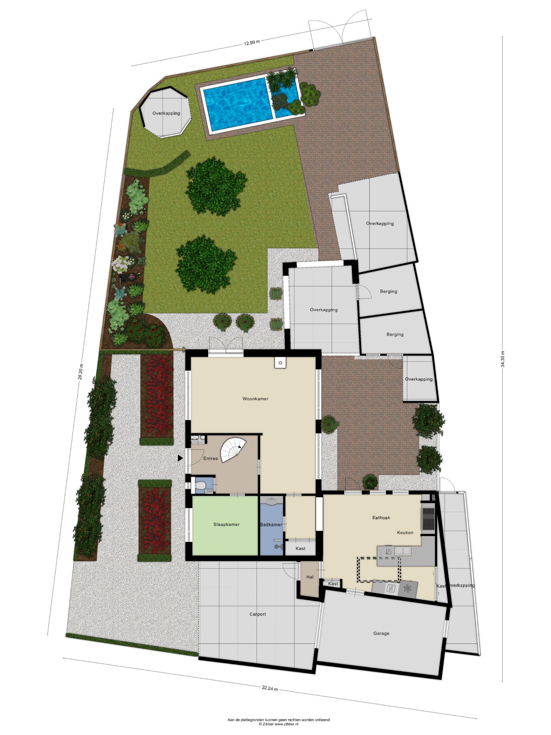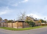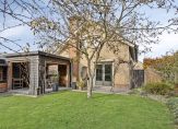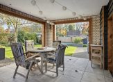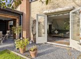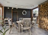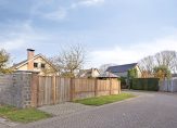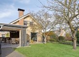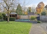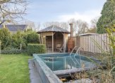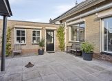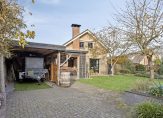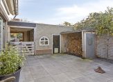 Achter het huis is een verharde binnenplaats. Dit is een beschutte ruimte die rechtstreeks vanuit de keuken bereikbaar is. Een overkapping met aansluitend tuinberging geeft een doorloop naar de mooi aangelegde tuin op het zuiden voorzien van een zwemvijver, gazon, verschillende bomen en planten. Er is volledige privacy in de tuin en het overdekte terras is een heerlijk plekje om te zitten. In de berging, voorzien van elektrische vloerverwarming, is een leuk buitenverblijf te maken voor bij het overdekte terras. Een deel van de berging is geschikt voor het tuingereedschap en er is nog een stallingsruimte in de tuin, welke vanuit een eigen oprit toegankelijk is.