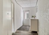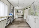 Hal met pvc vloer voorzien van vernieuwde en uitgebreide meterkast, moderne toiletruimte voorzien van wandcloset en fontein, ruime kelder, trapopgang naar de verdieping en toegang tot de woonkamer. De woonkamer met pvc vloer en gestukadoorde wanden beschikt over veel lichtinval door de grote raampartijen en is voorzien van een airco. De open keuken is voorzien van een ruime hoekinrichting voorzien van inbouwapparatuur zoals een inductie kookplaat, afzuigkap, oven, koelkast en vaatwasser. Achter de keuken is een portaal welke toegang geeft tot de kantoor/praktijkruimte. Deze multifunctionele ruimte is circa 20 m², is voorzien van een laminaatvloer en beschikt over een airco. Deze ruimte is vanuit de oprit met carport bereikbaar middels een eigen toegangsdeur.