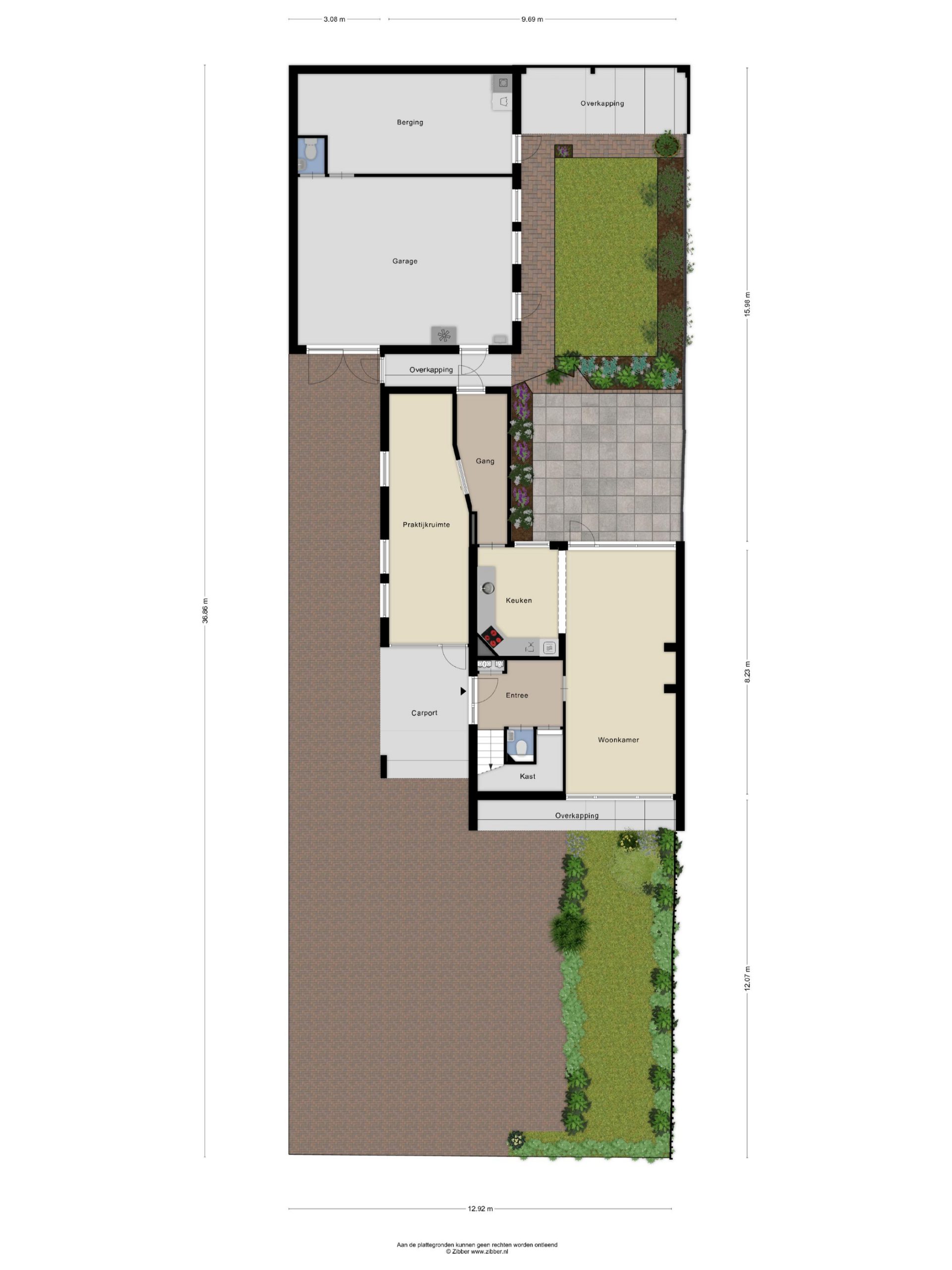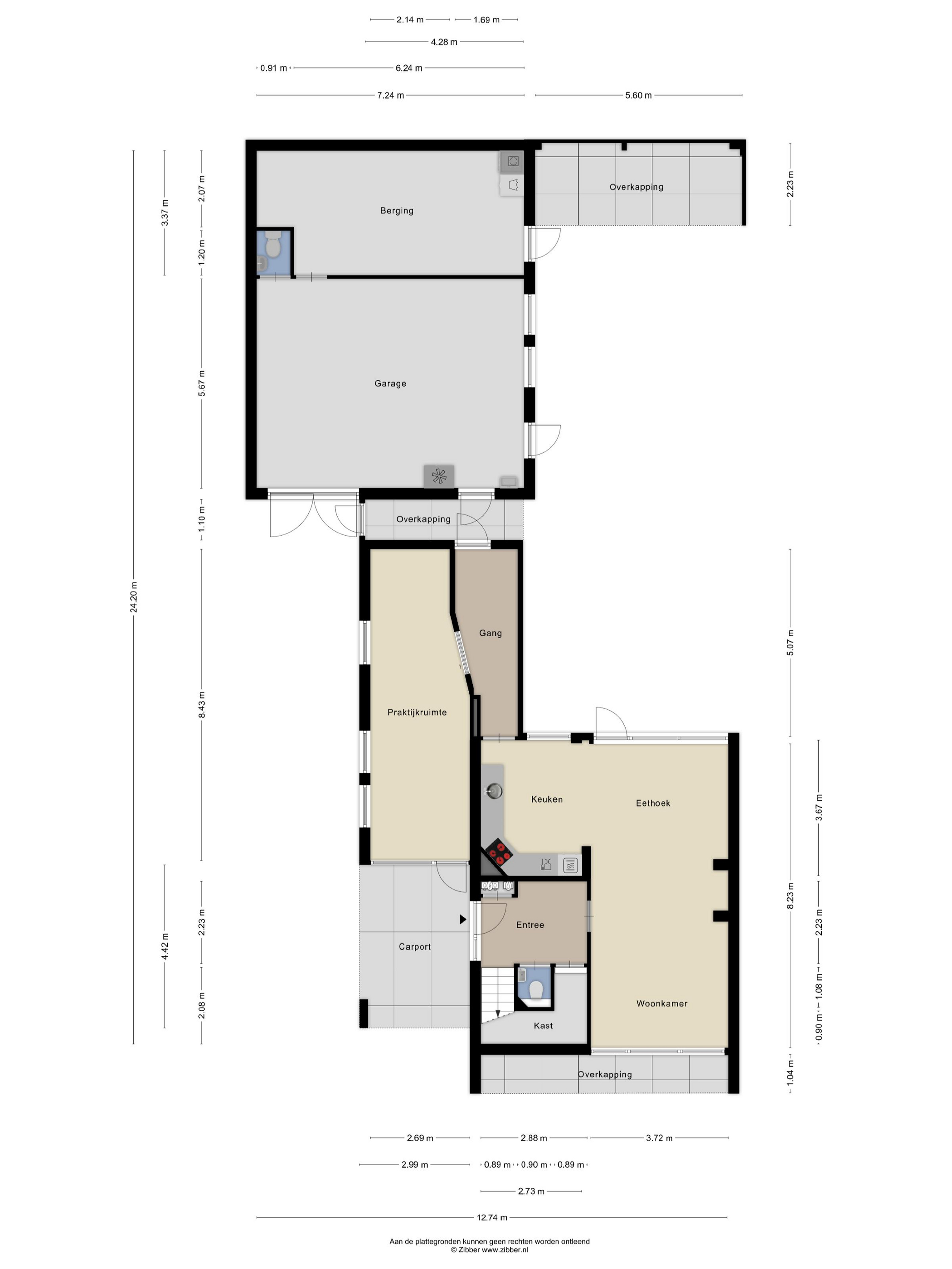 Aan de voorzijde van de woning bevindt zich een zeer ruime oprit waar meerdere auto’s geparkeerd kunnen worden en voor de praktijkruimte bevindt zich een carport.
