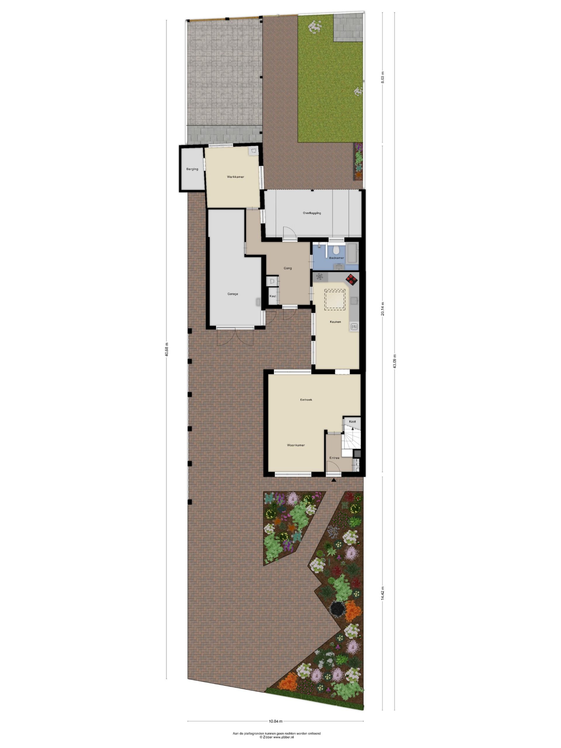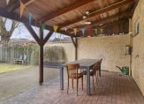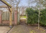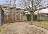 De tuin is uitgevoerd met een terras en gazon. Aan de achterzijde grenst de tuin aan een groot speelveld en biedt daarom volop privacy. Direct achter de woning is een veranda gebouwd. Dit is een eenvoudige overkapping, maar zorgt wel voor een beschutte plek om te zitten en van de tuin te genieten. Achter de slaap-/werkkamer staat in de tuin een grote pergola. De voortuin is zeer ruim, naast de nodige planten zijn hier ook enkele parkeerplaatsen op eigen terrein gemaakt.