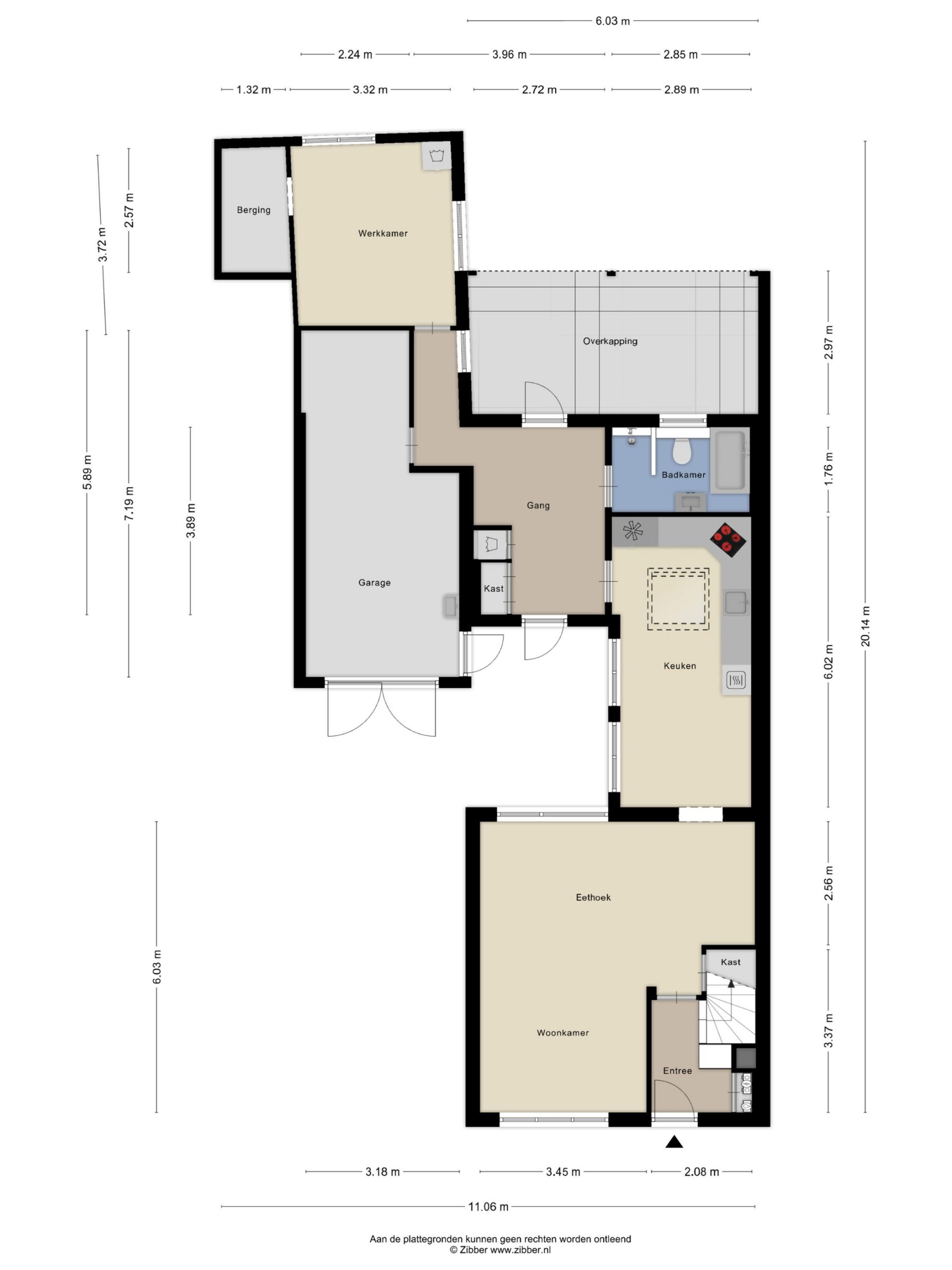 De garage van 20 m² groot is van binnenuit bereikbaar en heeft openslaande deuren naar de oprit. In de garage is elektra aanwezig, een uitstortgootsteen en smeerput. Een mooie klus-/stallingsruimte.