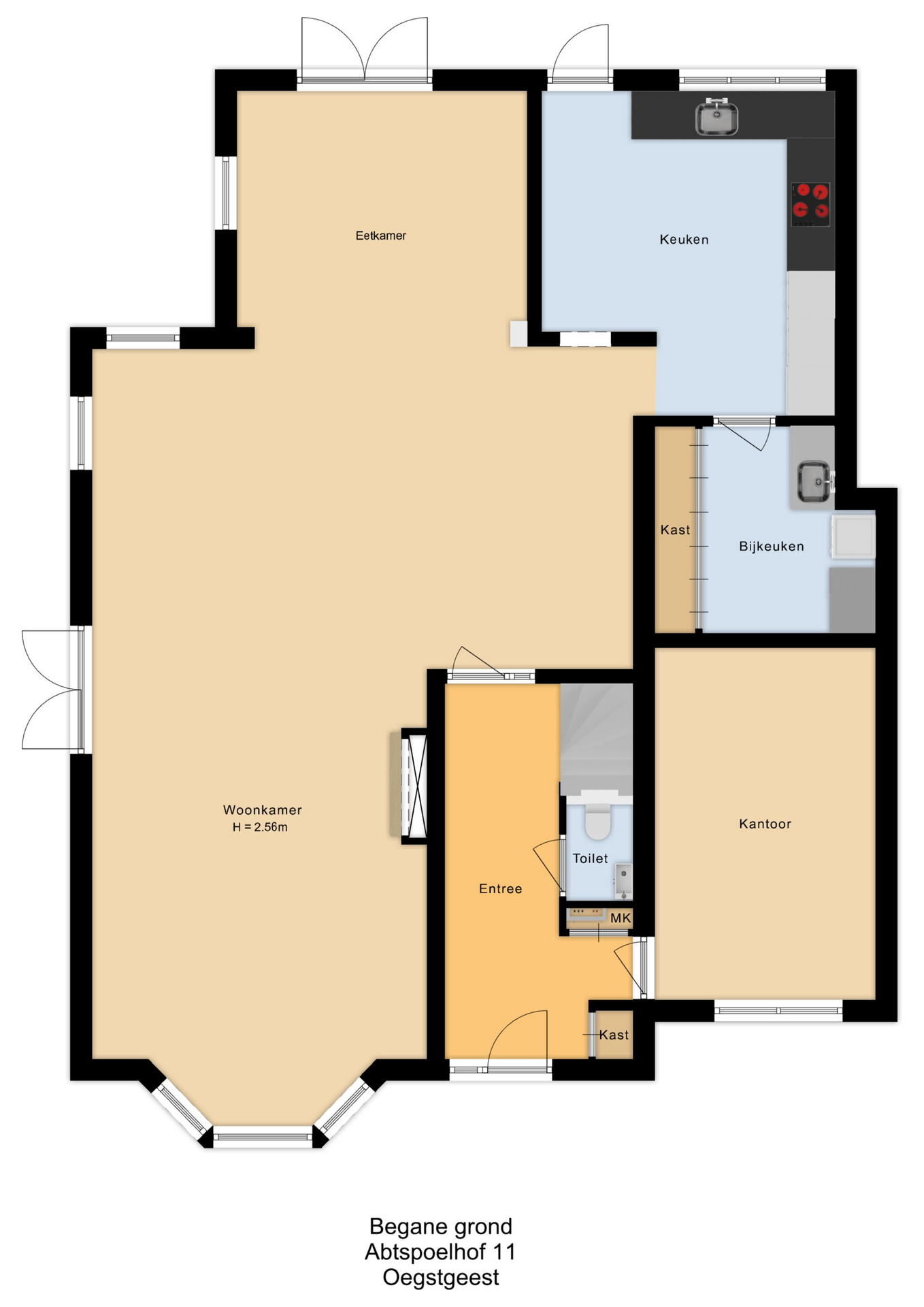 Via de gemeenschappelijke toegangspoort bereik je de woning. Binnen word je verwelkomd door een ruime hal met garderobe en toilet. De kantoor kamer op de begane grond biedt volop mogelijkheden: werken aan huis, praktijkruimte of een extra slaapkamer – het kan allemaal.