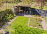 De tuin biedt bovendien volop praktische ruimte, met een handige schuur voor opslag en tuinspullen.