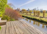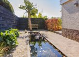 Achterin de tuin nodigt een charmante veranda uit tot lange avonden buiten. Direct aan de sloot ligt een idyllische vlonder, perfect om een extra zitje of terras te creëren dicht bij het water. Een stijlvolle spiegelvijver vormt het rustpunt van de tuin en versterkt het gevoel van harmonie.