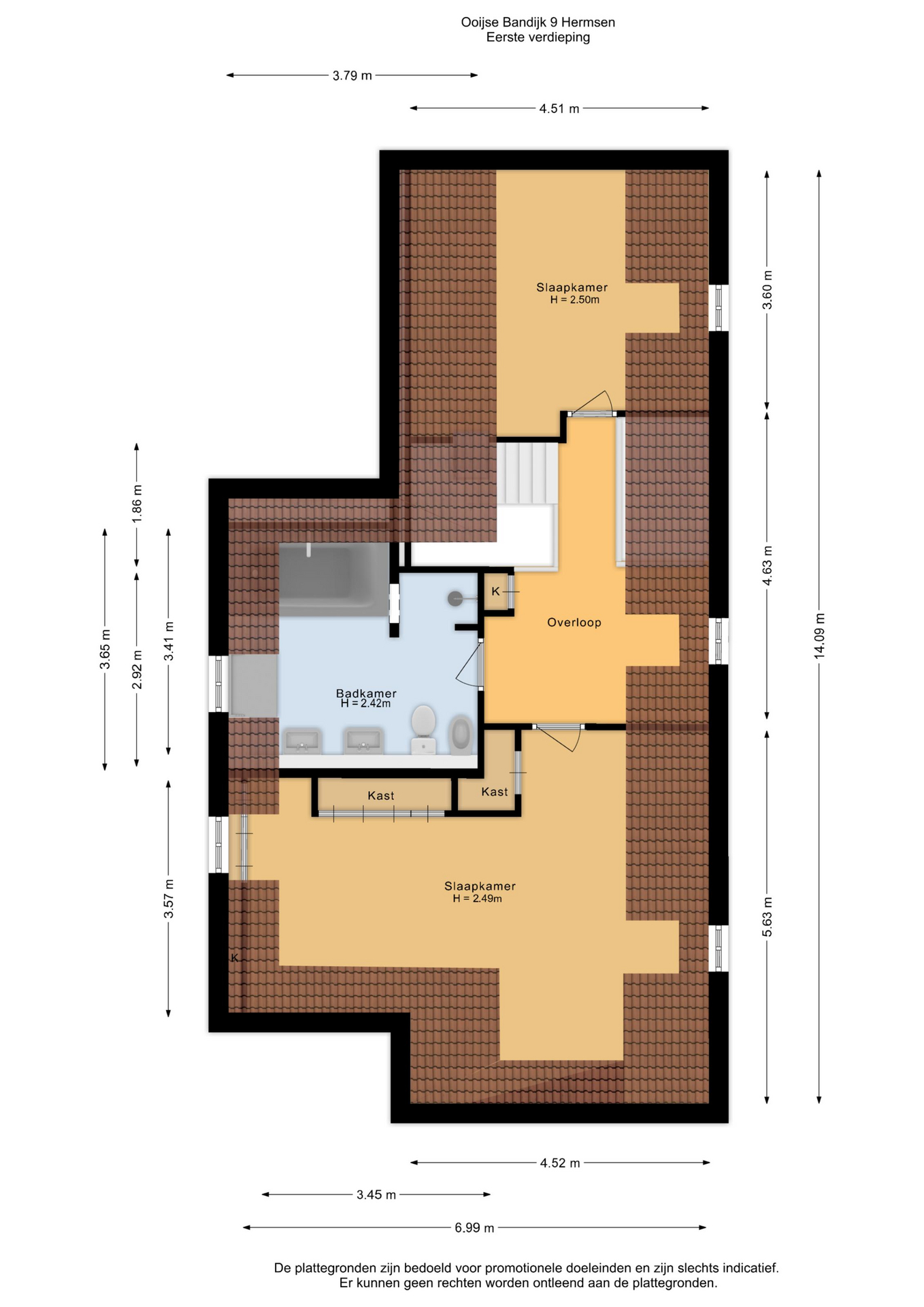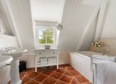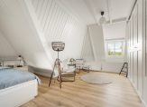 verdieping: overloop met vaste kast/ slaapkamer met dakkapel / grote L-slaapkamer met twee dakkapellen / badkamer met vloerverwarming voorzien van twee vaste wastafels, toilet, bidet, bad en inloopdouche.